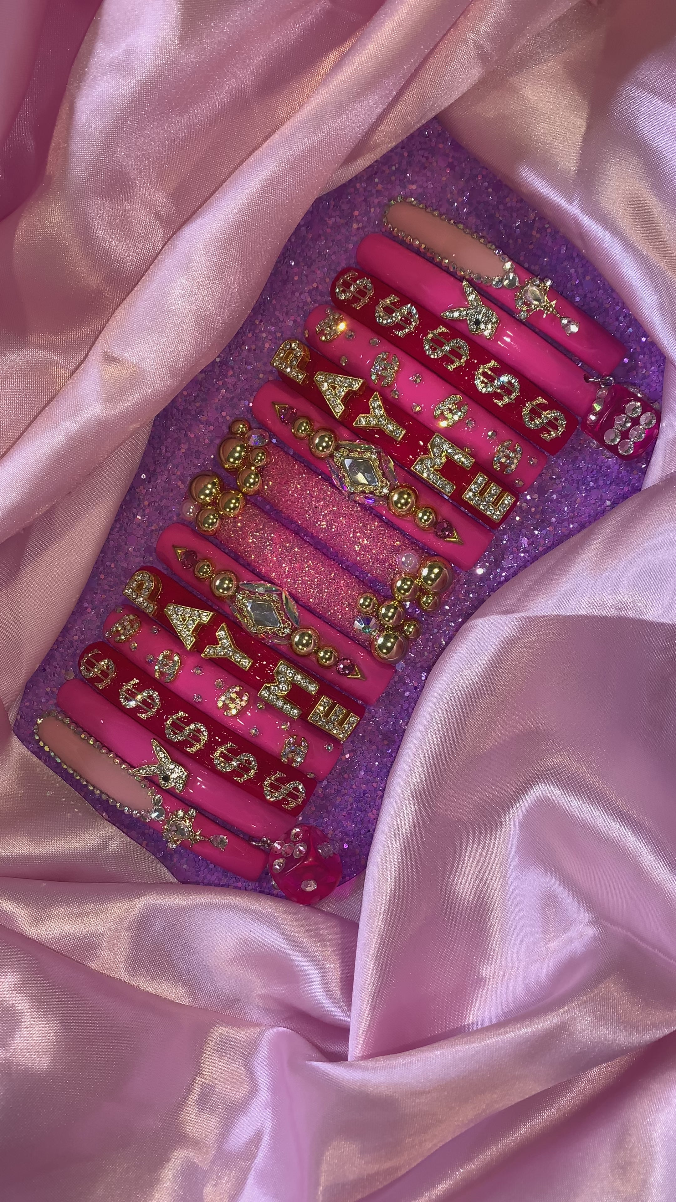 This set features 5XL Curved-long coffin nails drenched in a hot pink glitter. Barbiecore palette, layered with high-shine gloss and heavy gold pearls. Multiple nails are stacked with 3D gold PAY ME Letters, designer playboy bunnies, and rhinestone dice charms. Perfect Set for a Wild Photoshoot!!